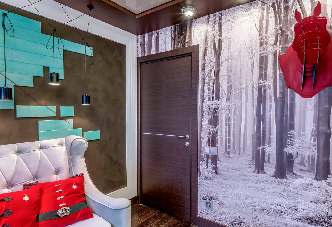 Bright wallpapers will become an accent that dark doors will not interfere with.
