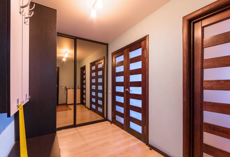 On the picture an example of how you can choose the color for the entrance and interior doors of the corridor, where they are made in the same style, shade and are equally complemented by dark platbands.