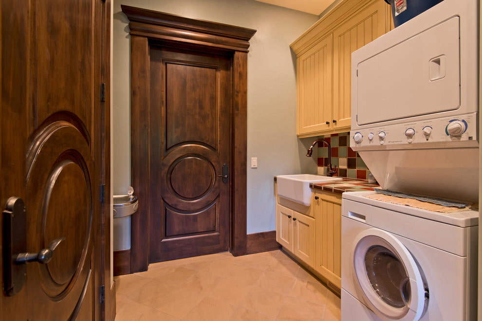On the picture the entrance hall of a country house, where all the wood trim and laminate in shade matches the color of the front door.