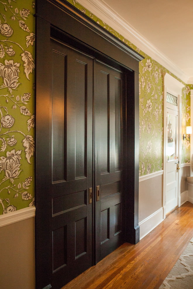 The doorway will merge with dark wallpaper, so if the goal is to disguise it, then you can combine the color of the walls with the doors.