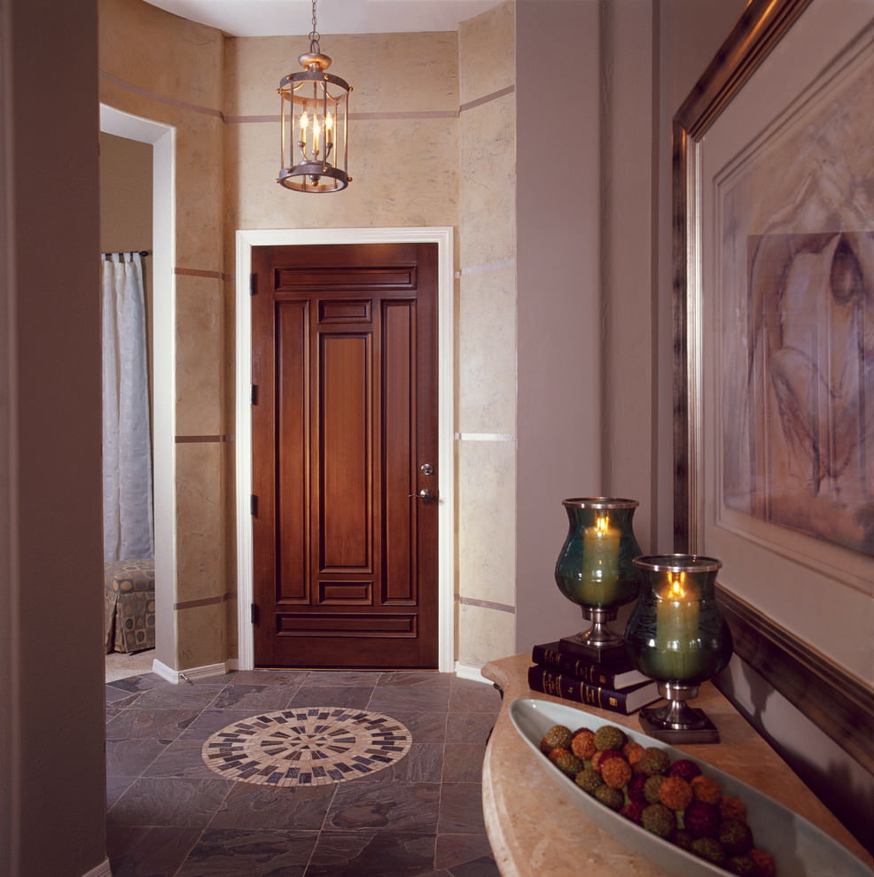 On the picture massive doors with a carved pattern in the interior of a classic hallway of a house with a dark stone floor.