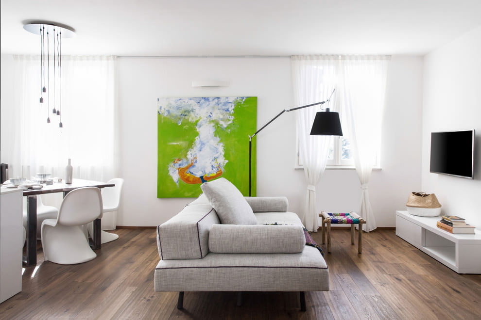 Light furniture can be combined with any floor in the interior. White furniture will create a lightness of classics and Scandinavian style in the interior, along with a dark brown floor. Beige, pastel pink, light wood color furniture is suitable for gray, brown, graphite floor.