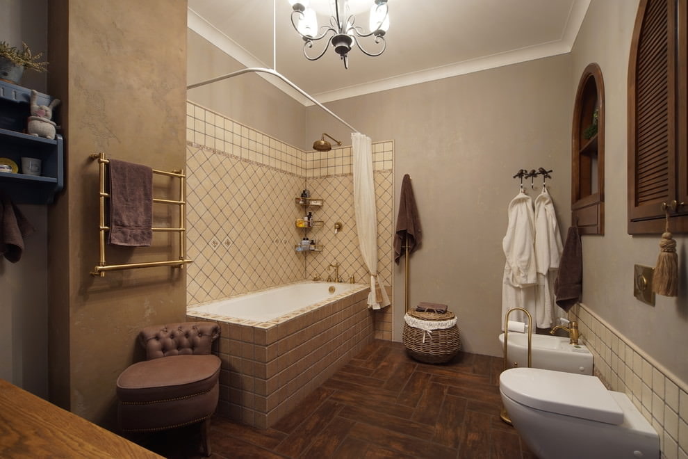 In a classic style, it is distinguished by its sophistication and the use of natural materials for decoration. The flooring is most often of a laminate or parquet board in wenge or bog oak, which is combined with pale red, beige, white walls, burgundy or emerald tapestry.Skirting boards and doors are best matched to furniture or walls. For the bathroom, one-color matte tiles are used, with ornaments, or wood-like tiles.