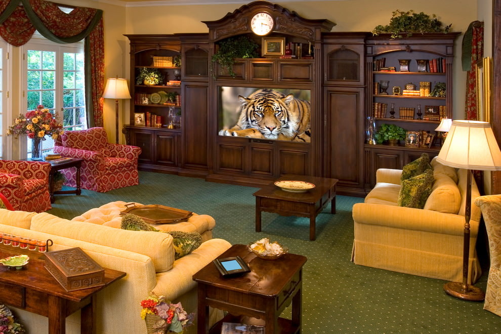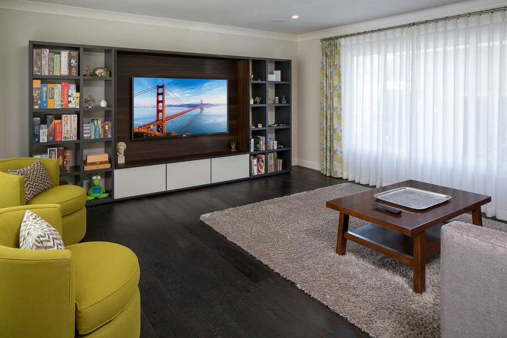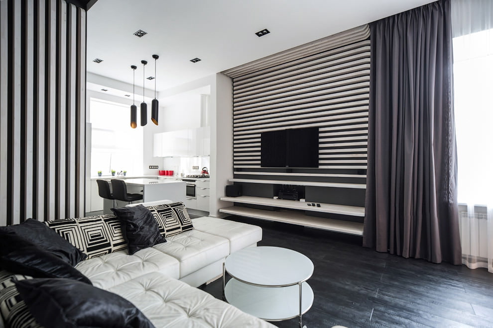 For the hall, it is better to use a parquet board, laminate, carpet. Warm material, fireplace, soft paired furniture will set you up for a pleasant conversation. In a small living room, it is best not to use black flooring.