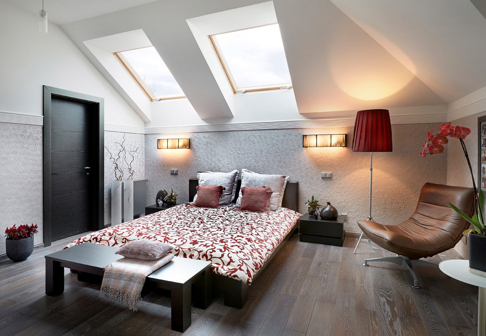 On the picture the interior of a spacious bedroom on the attic floor with a dark laminate on the floor and the use of light orange bark beetle plaster for wall decoration.