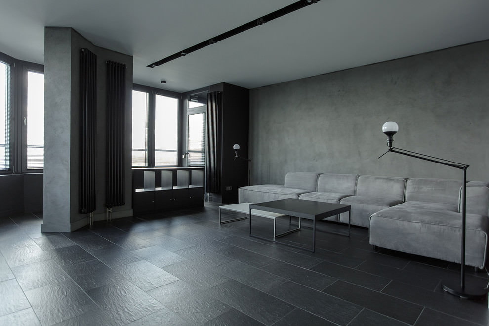 This style is not limited to specific dark colors, black tiles, dark brown laminate, painted board, dark parquet, dark gray or dark blue self-leveling floor will do.