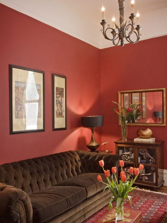 It is permissible to focus not on furniture, but on the wall. The color goes well with interesting textured plaster (rain, stains, bark beetle) and creates a positive mood in the main room of the house. But the easiest way to achieve a shade is by exposing the red brickwork (of course, if you live in a brick house) or by creating an imitation of it.