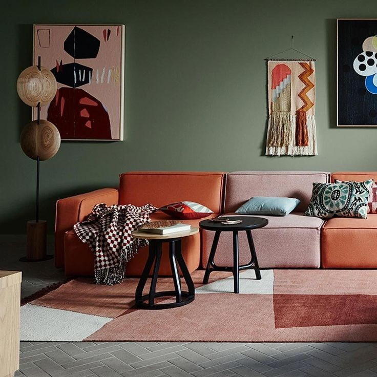 Usually colored upholstered furniture is chosen: armchairs, sofas, chairs. Thanks to the wide range of upholstery fabrics, terracotta can be pink, orange or brown. The texture also varies: if dark tones, like burgundy, look better with a wicker mat.