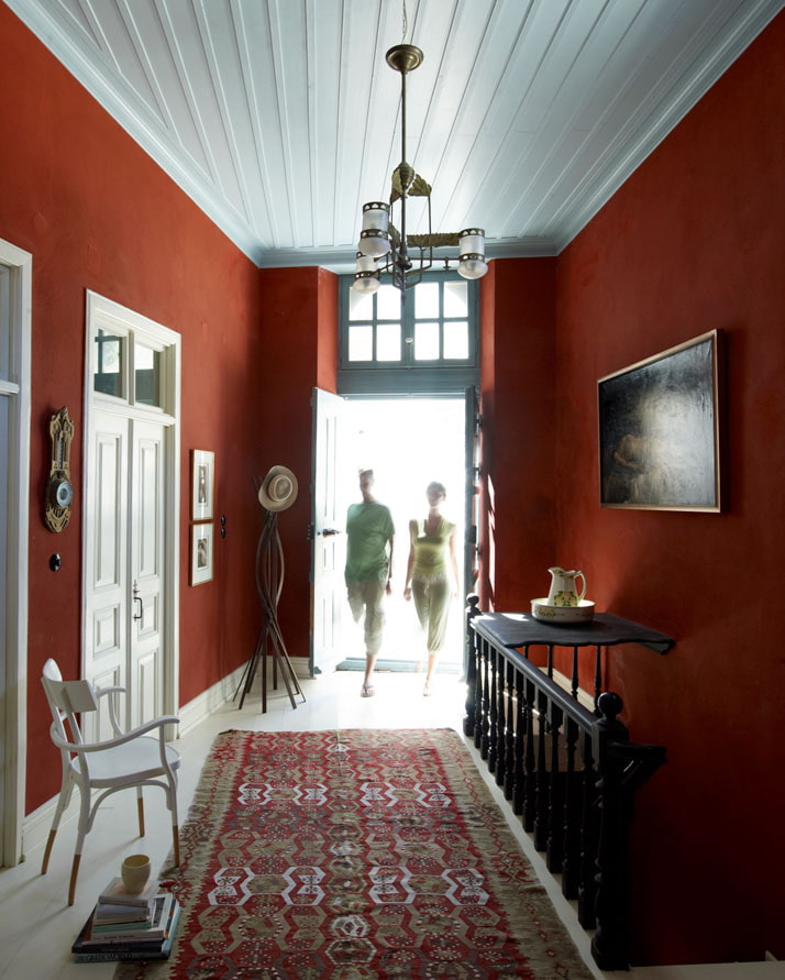 Make the walls of the corridor red and orange so that every guest who enters from the doorway is charged with the positive energy of your home. And the owners will be pleased to return to such a sunny apartment every time.