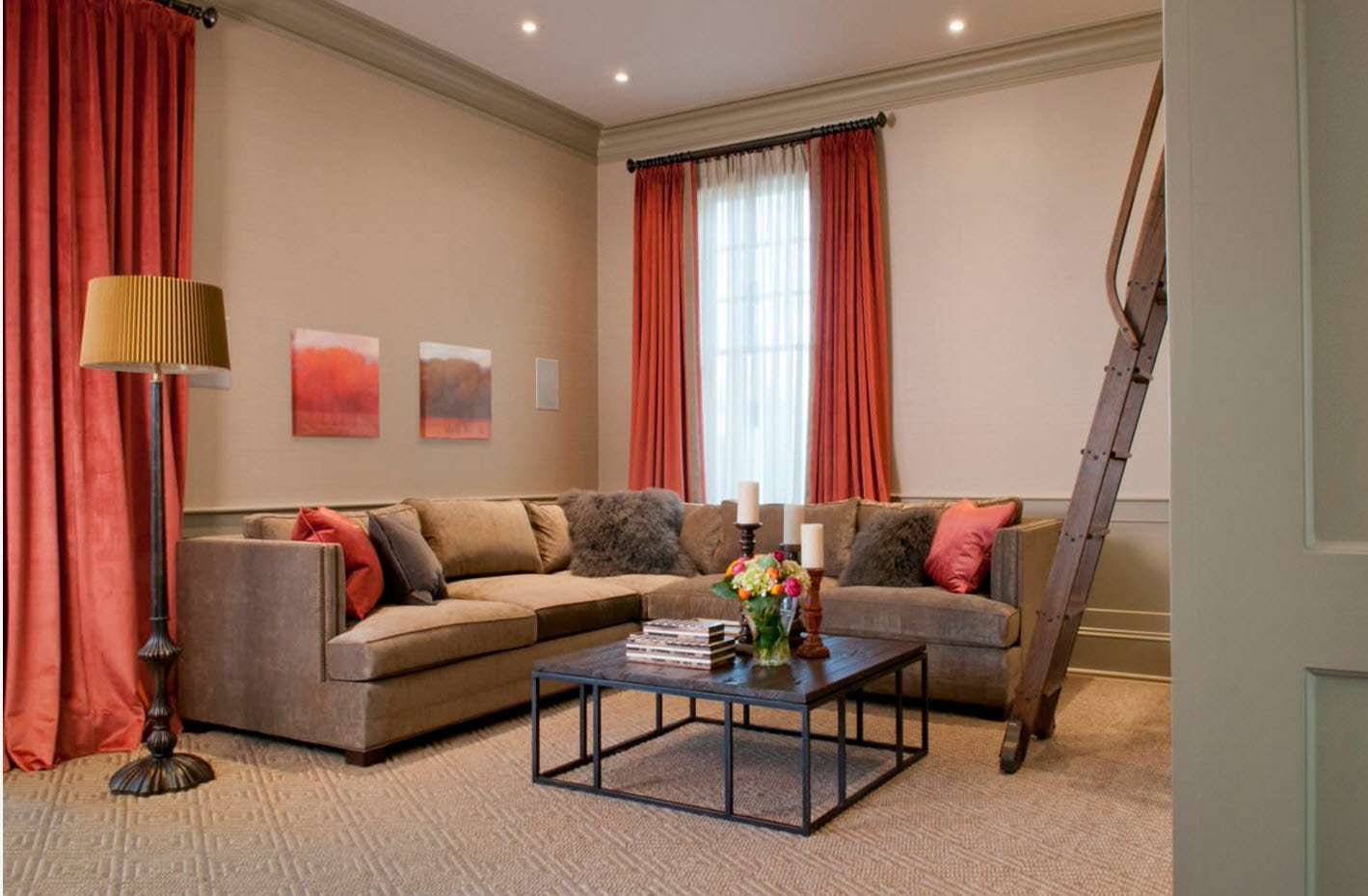 Often, a red shade is used in carpets: both warm monophonic with a long pile, and homespun country-style rugs, alternating an orange pattern with beige, brown, gray.