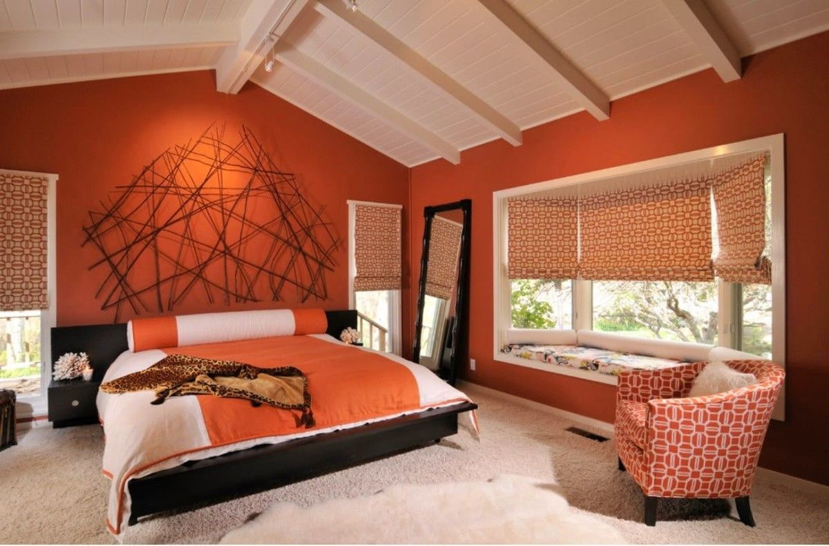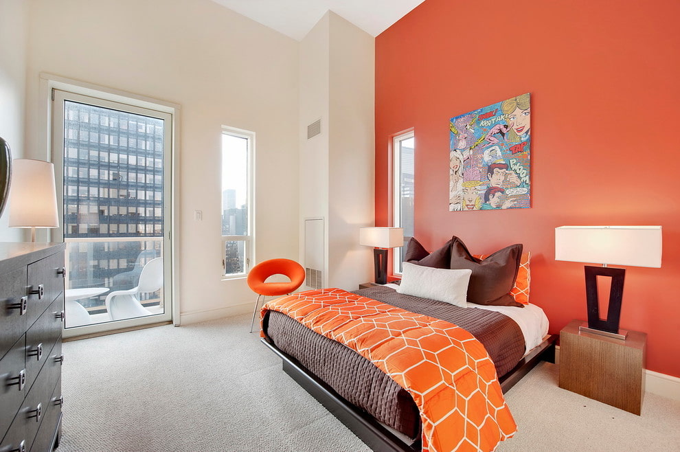 No matter how the brown undertone softens the aggressiveness of red, the abundance of combinations in the bedroom is fraught with insomnia. Do not give up using it altogether: just place the color behind bed... In the form of an accent wall or a soft, cozy headboard.