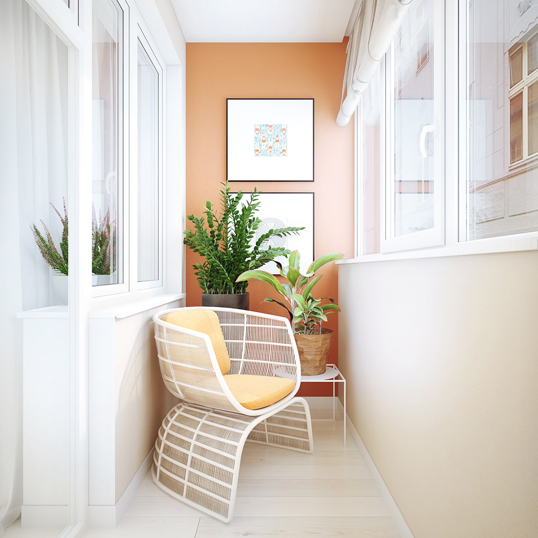 You can fill the loggia with a sunny mood using a soft armchair with red-red upholstery or small accessories: pillows, rugs, curtains.