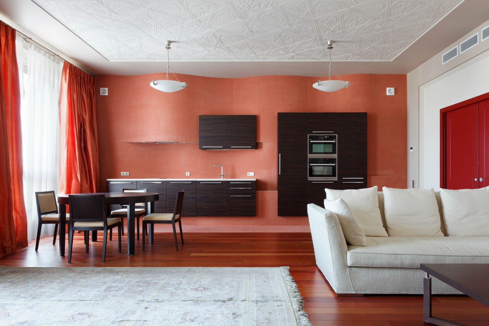 It is better to leave the ceiling white or choose another neutral shade for it, the red-orange from above will crush.