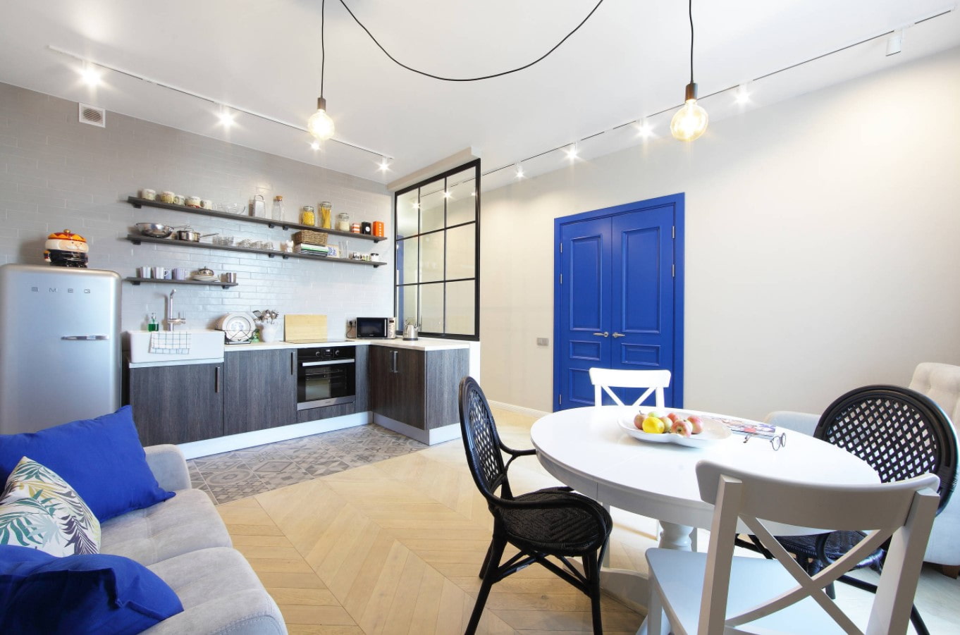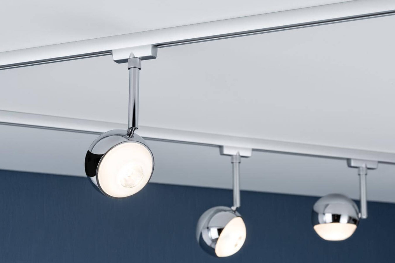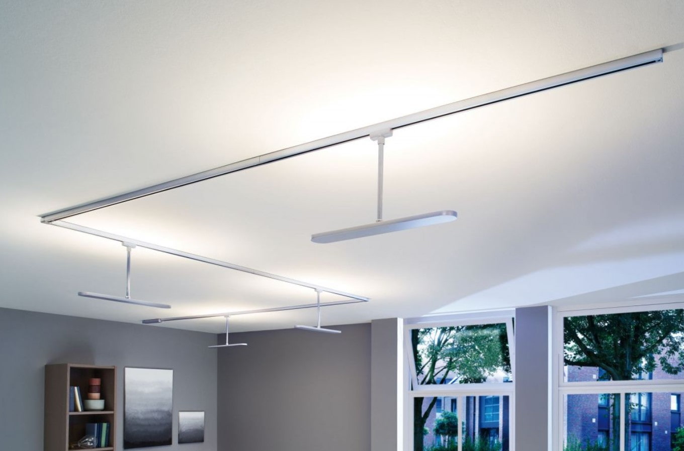 When there are not enough lines, but you do not want to occupy the entire territory of the ceiling with a track. Often used in corner kitchens, over corner sofas, in L-shaped layouts.