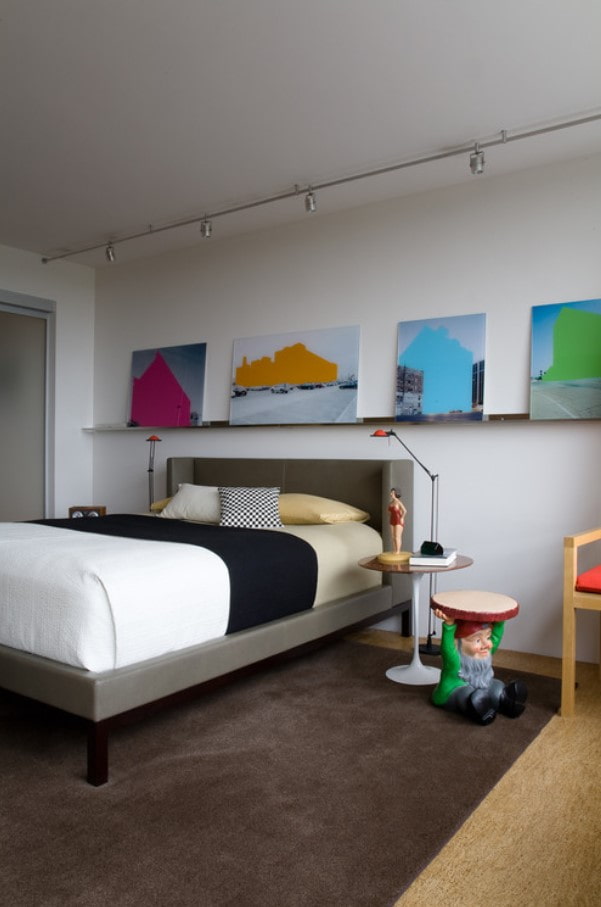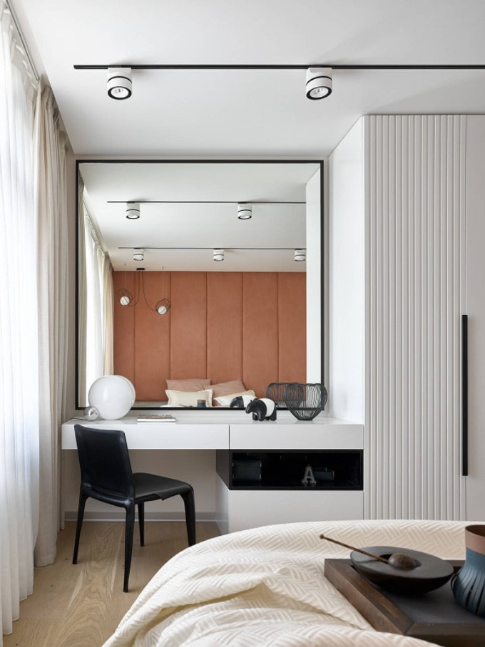 Track lights in the bedroom play the role of the main light, and are also present in the design of additional areas: as a backlight for a wardrobe or dressing table.