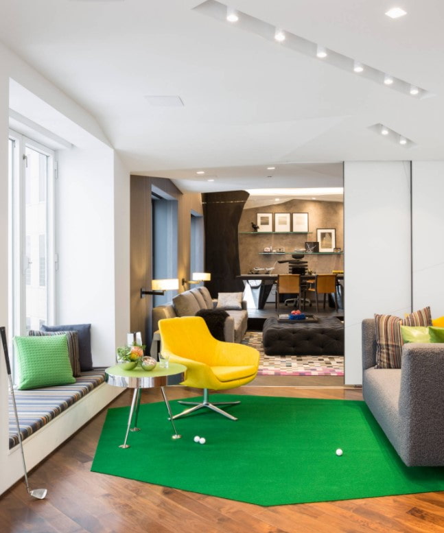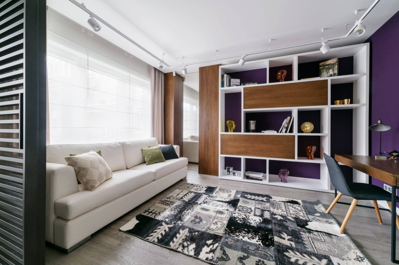 There are many scenarios for use in the hall: in addition to a relaxation space with a sofa and a TV, the living room has a desk, a play area, a corner for reading or hobbies. Therefore, scripts are built in accordance with the functionality.