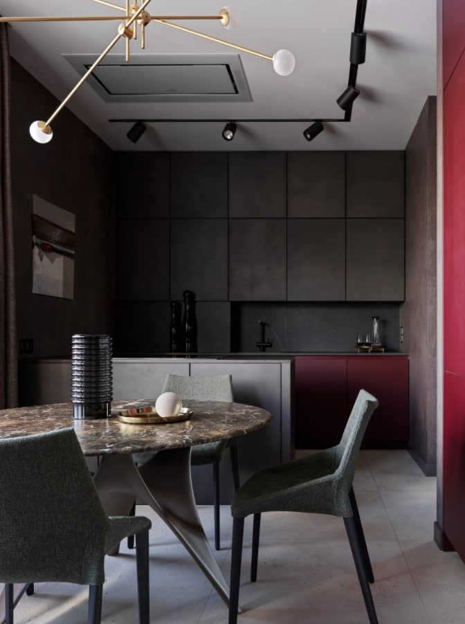 Lighting above the table top should be bright, above the table - soft, diffused. Instead of high ceiling spots in the area of the dining table, bar, peninsula or island, it is permissible to mount low suspensions on the bus.