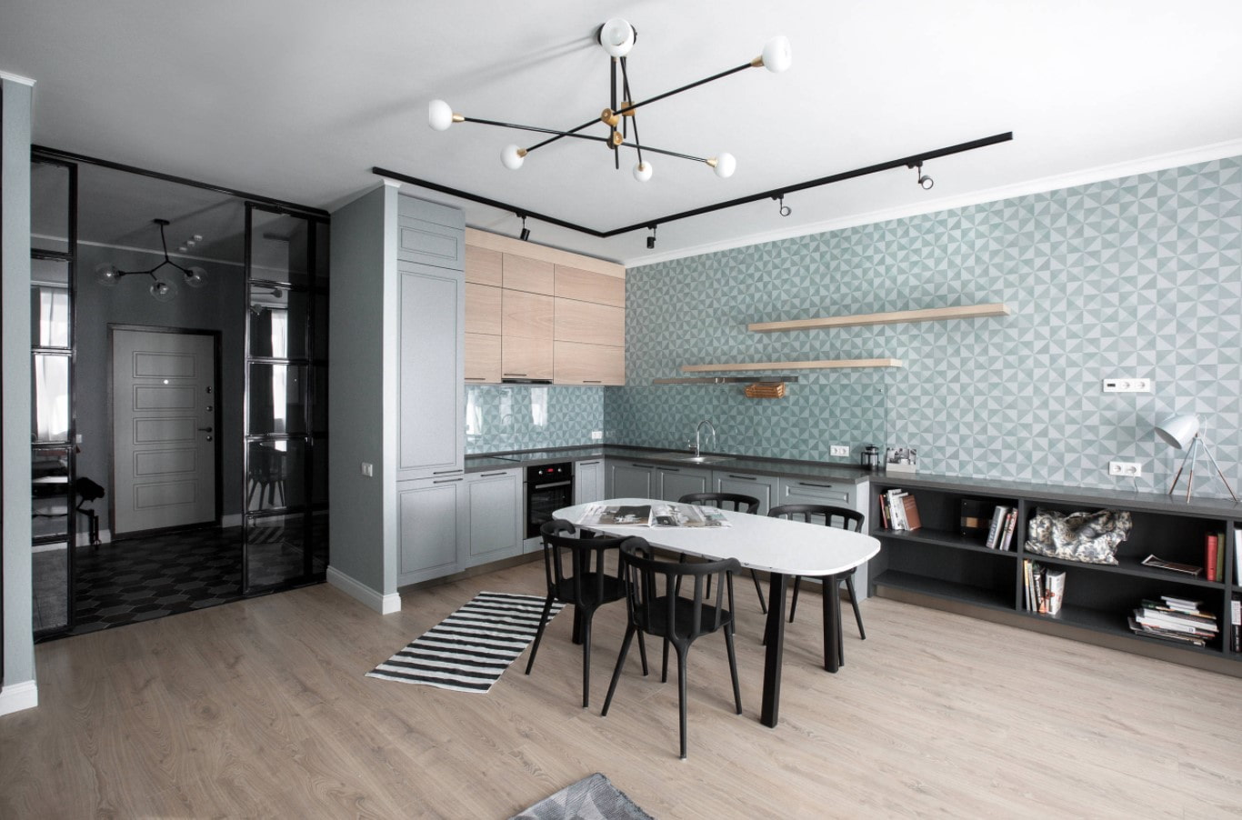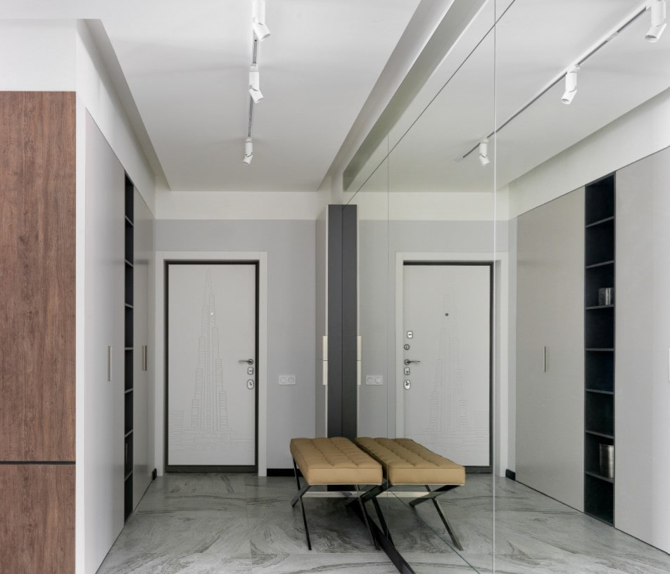The flow of light from the corridor to the living room looks spectacular - lamps in this case are used as a force that unites the space.