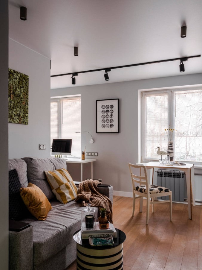 - First: when track lights are part of the overall lighting concept. In this situation, they illuminate one of the zones: for example, a work table, a countertop in the kitchen, a wardrobe.