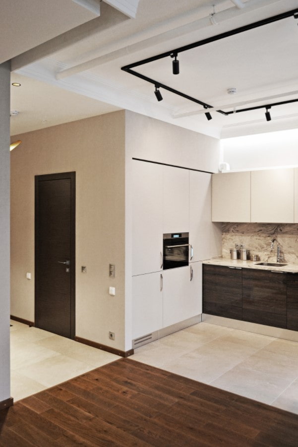 Almost all kitchens have 2 zones that definitely require lighting: the dining room and the work area. In this case, the ideal solution would be a two-phase bus, so that the zones can be highlighted separately.