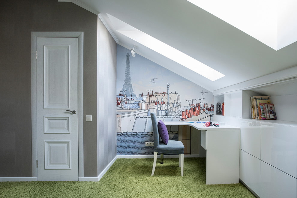 In the photo there is a loft-style teenager's room and a gray interior door with frosted glass inserts.