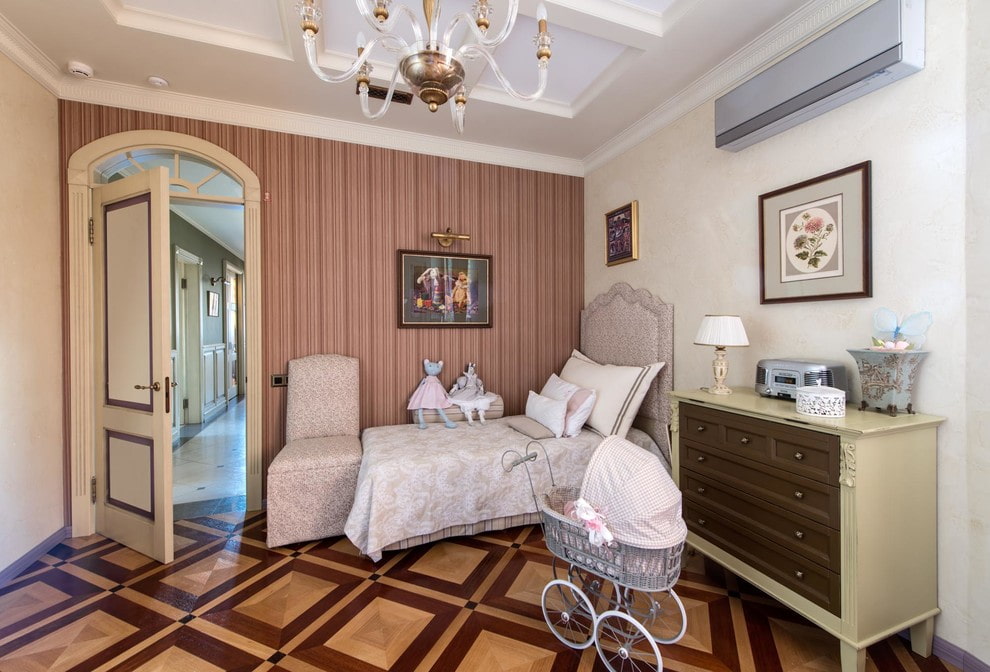 In the photo there is a children's room for a newborn, decorated with a glossy beige door.