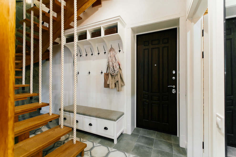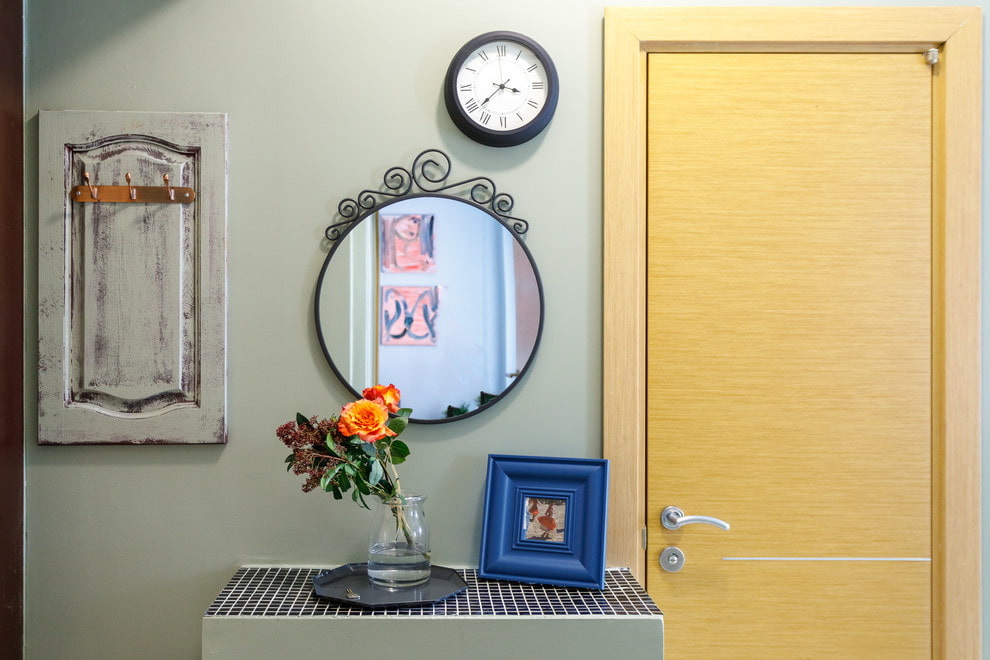 The photo shows the interior of the hallway in light colors with a bright turquoise entrance door.