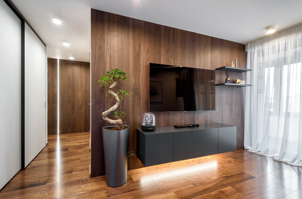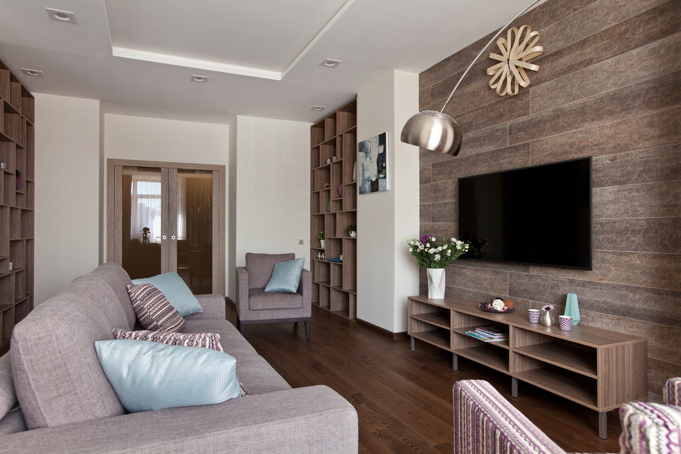 The photo shows the interior of a spacious living room, decorated with a hinged TV stand.