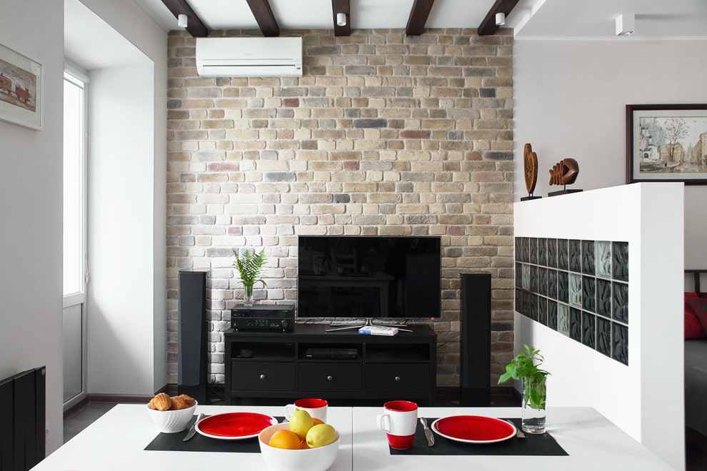 For an industrial loft, they choose a rough metal floor model for a TV or a structure made of wood combined with metal, which outwardly resembles an aged chest. In addition, any non-ordinary solutions are easily applied here, for example, the curbstone can be replaced with a wooden box or mobile pallets on wheels.