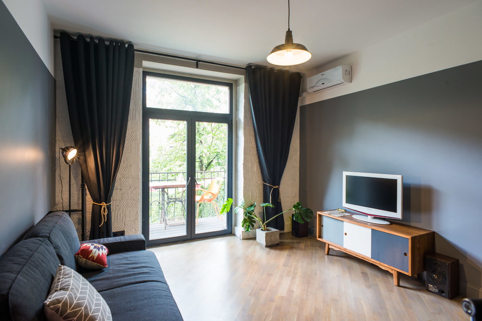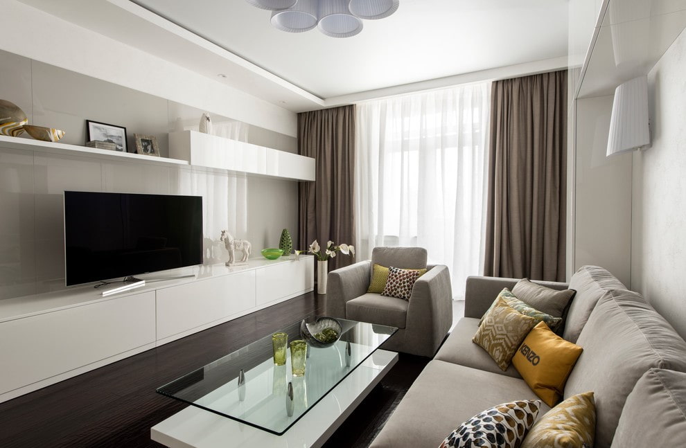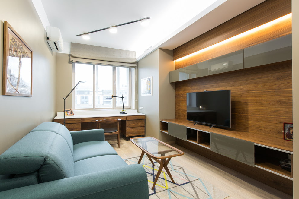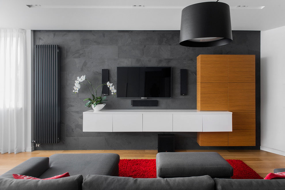 Low, narrow TV cabinets in black, white or gray colors are suitable here.