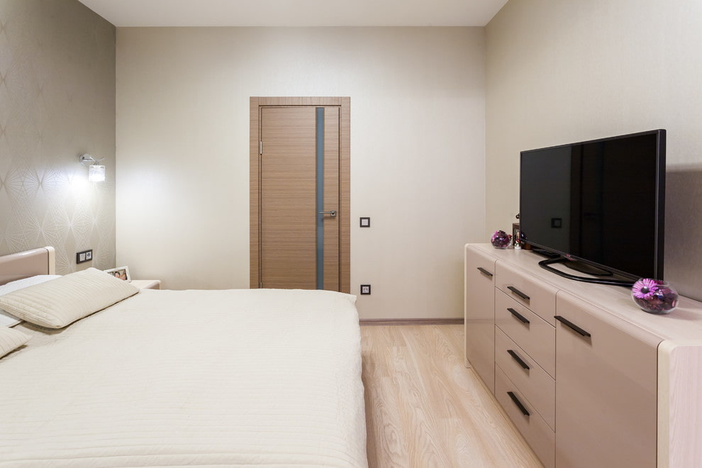 In the interior of the bedroom, there is often a compact chest of drawers, a swivel transforming cabinet or hinged narrow products for TV and equipment, which look very light and weightless. In order to give the room even more airiness, constructions with open sections or glass doors, differing in a wide variety of spraying, are used.