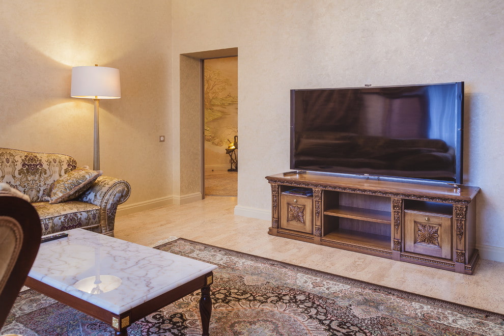 The photo shows a living room in a classic style with a semicircular TV table, decorated with carved decor.