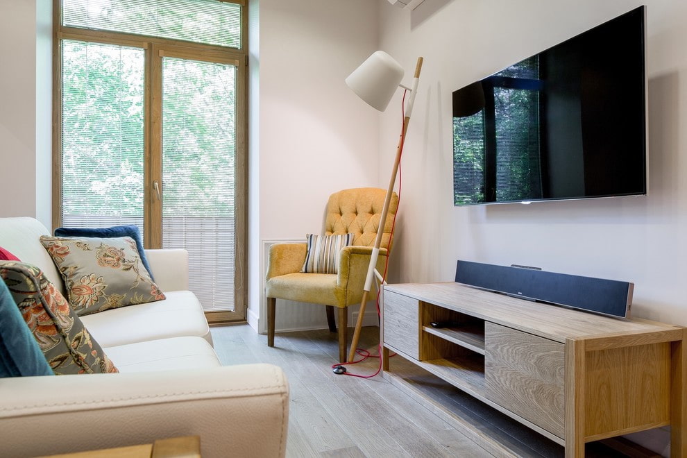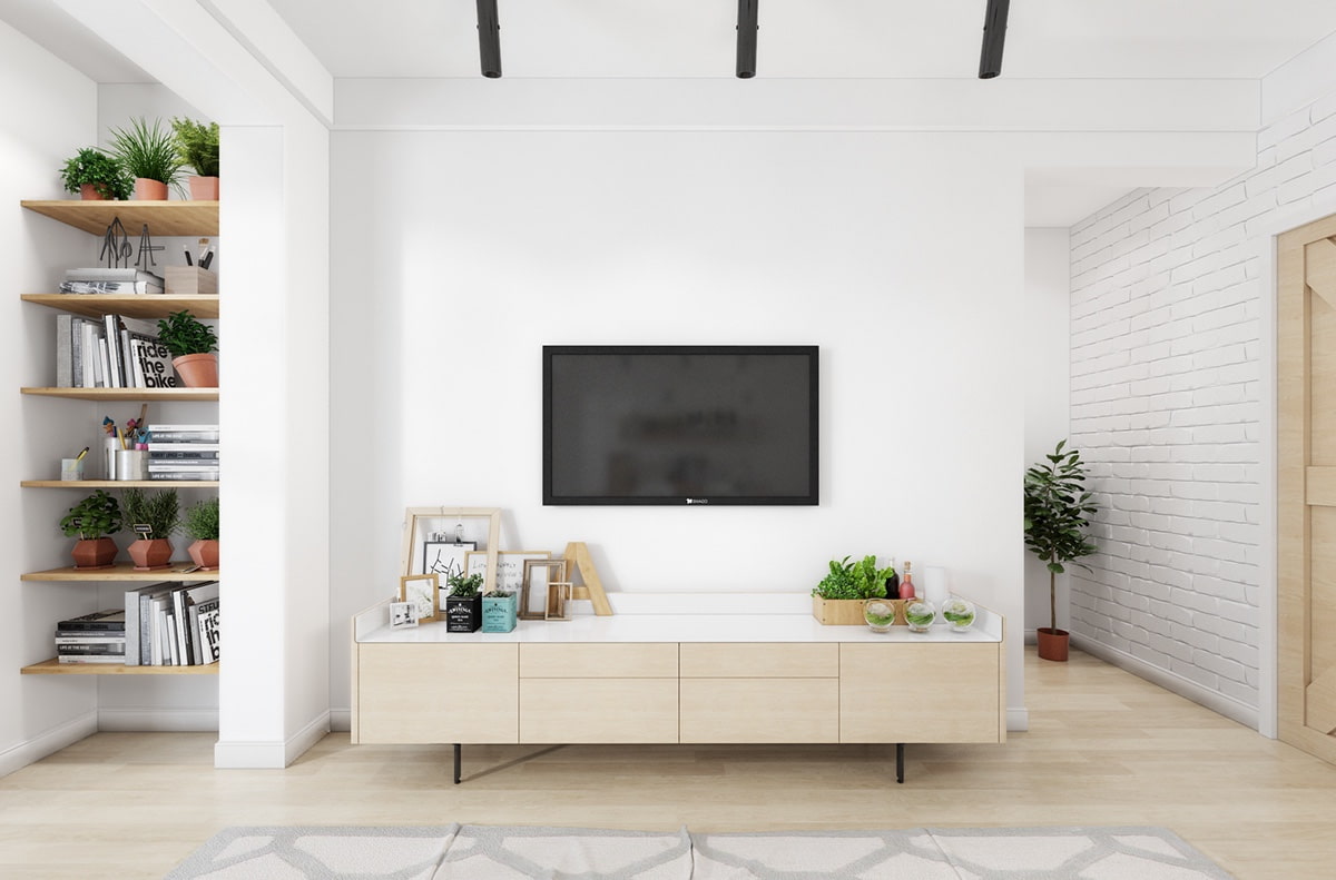 Simplified products with rectangular outlines, mainly in white, gray or other pastel colors, will perfectly complement the scandi interior. Quite often in this style there are pendant or floor-standing retro TV stands made of chipboard, natural wood or plastic.