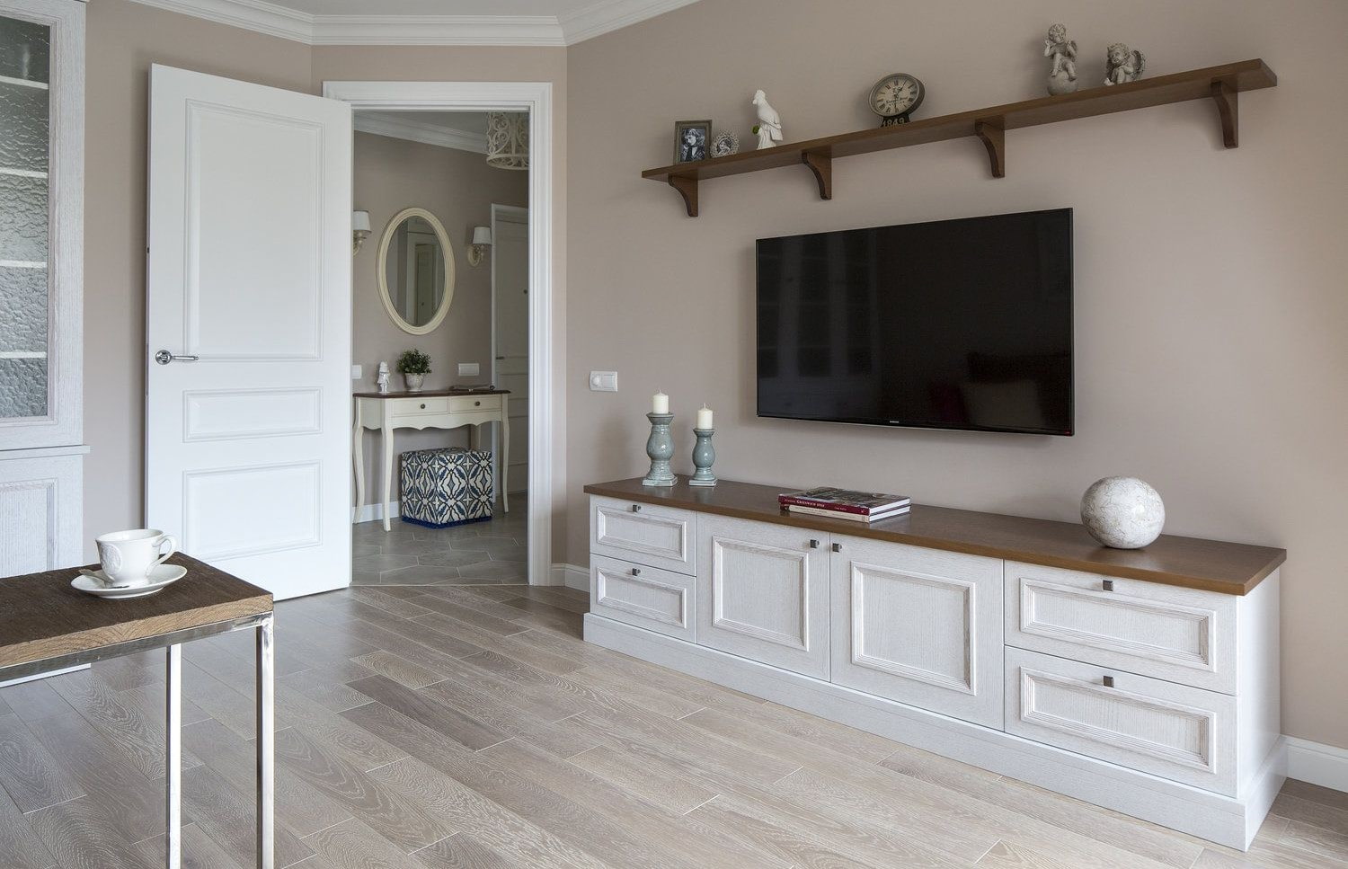 In the photo there is a hall with a long floor TV stand, made in white.