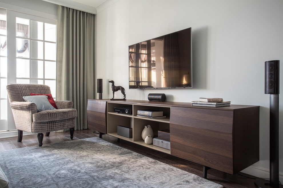 A curbstone in the hall is selected taking into account the dimensions and style of the room. Any wall-mounted or floor-standing models will be appropriate here; constructions with a bracket, which, due to the tilt-and-turn mechanism, allow you to unfold the LCD screen, changing the viewing angle, and, thanks to a special cable channel, hide all the wires, can be an excellent solution.