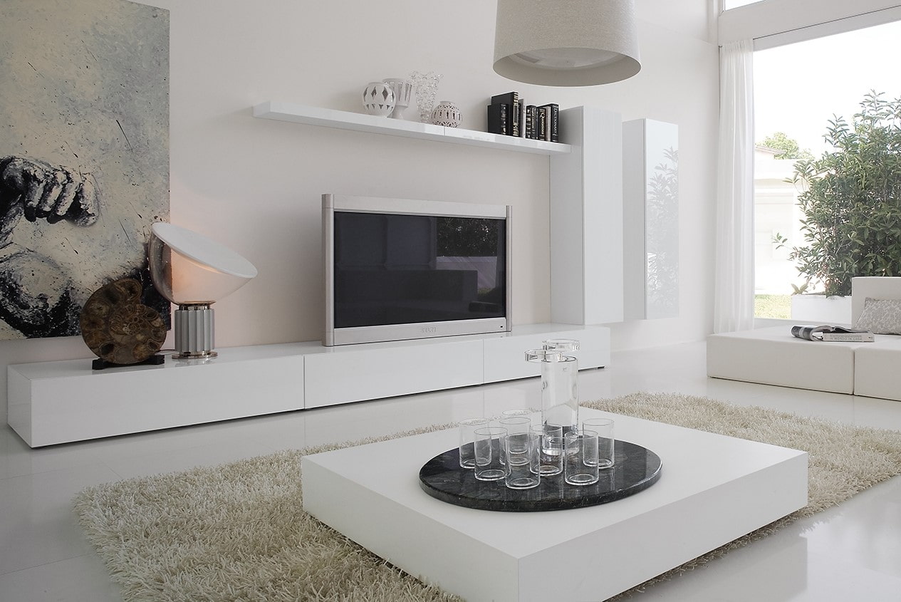 The photo shows the interior with a small floor TV stand, made in white.