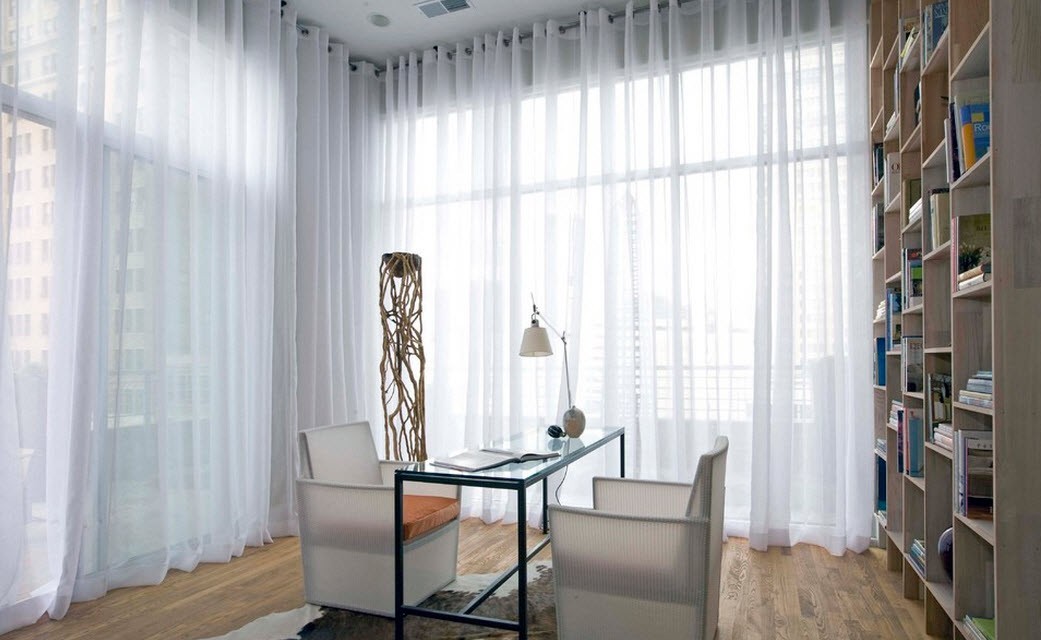 In the photo there is an office and windows decorated with white tulle on eyelets.