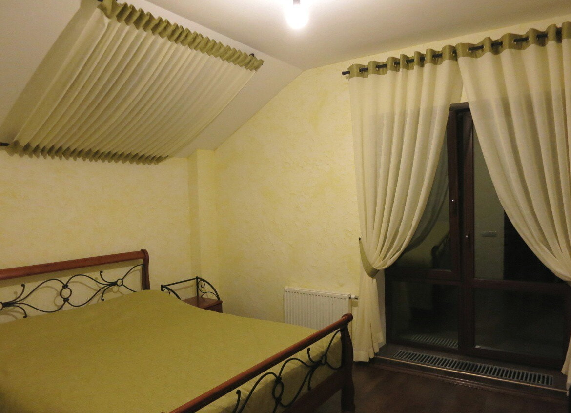 The attic has a complex configuration, with windows on a sloping wall. Light drapery will be appropriate in this case. When decorating attics, the curtains are complemented with a lower cornice.
