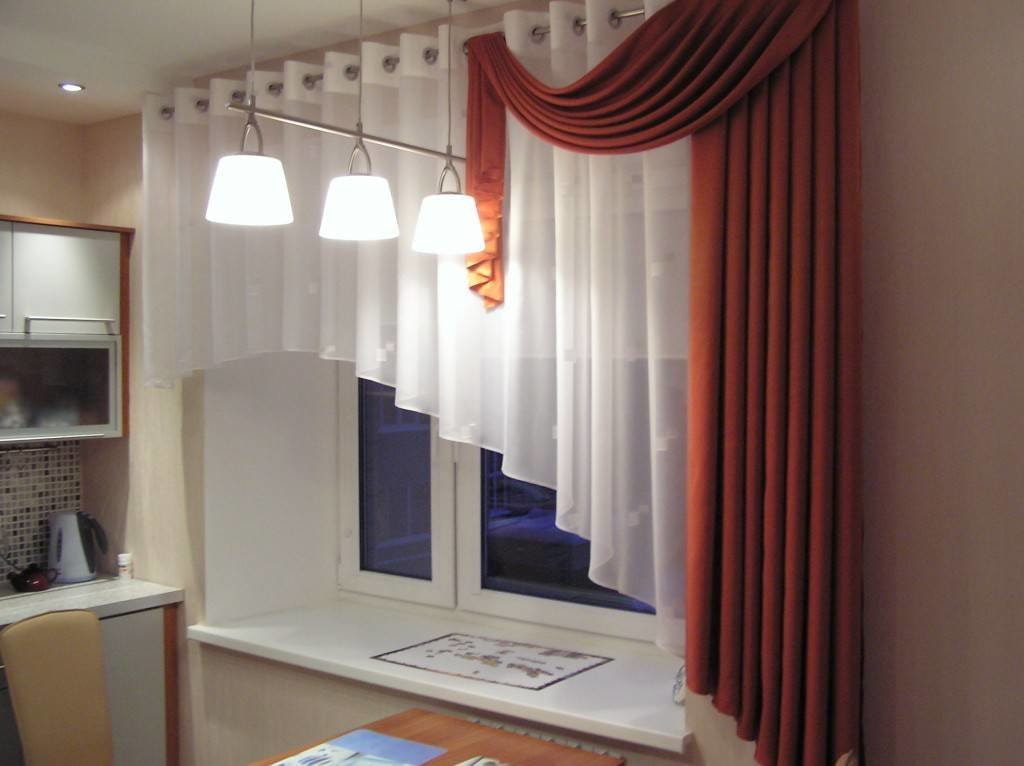In the photo, a short sand-colored tulle in the interior of the kitchen.