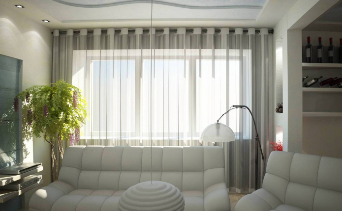 In the photo there is a living room with tulle combined with a lambrequin.
