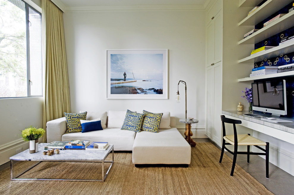 If the area of the room allows, then the corner furniture can be entered into the bedroom, which in this case will serve as a living room.