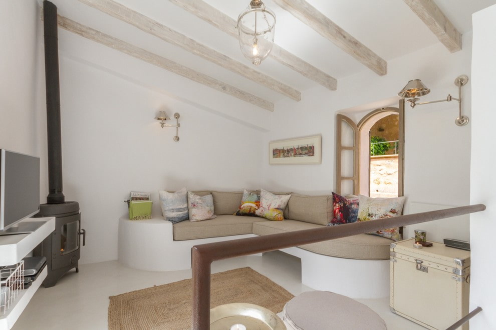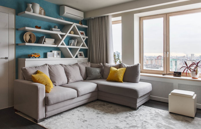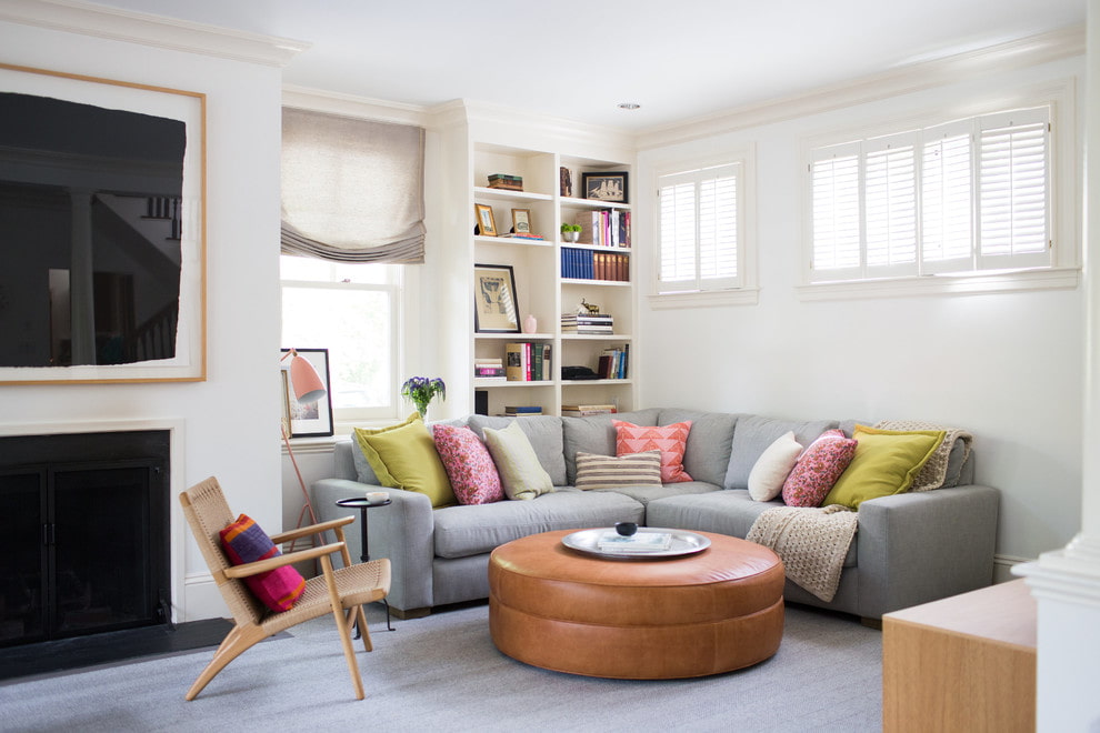 The most popular option for placing corner furniture is close to the walls. This activates the area, which usually remains free, and creates a cozy corner.Opposite can be a TV or fireplace.