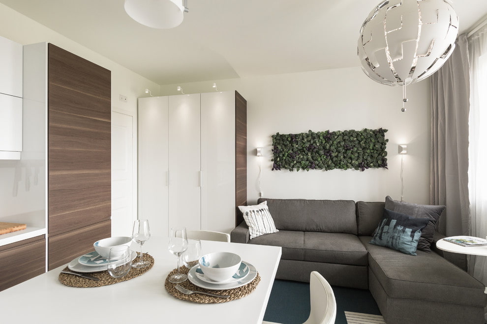The corner sofa transforms the kitchen into a dining room. In a large room, a soft structure with a dining table will fit easily. Behind it can accommodate 4 to 7 people. Also, using the kitchen sofa, you can zone the space, which is especially important for studios.
