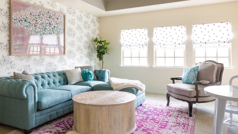 Blue and turquoise sofas look bright when placed in a solid, light decor. Olive and blue are cool shades, they bring a touch of freshness to the atmosphere.