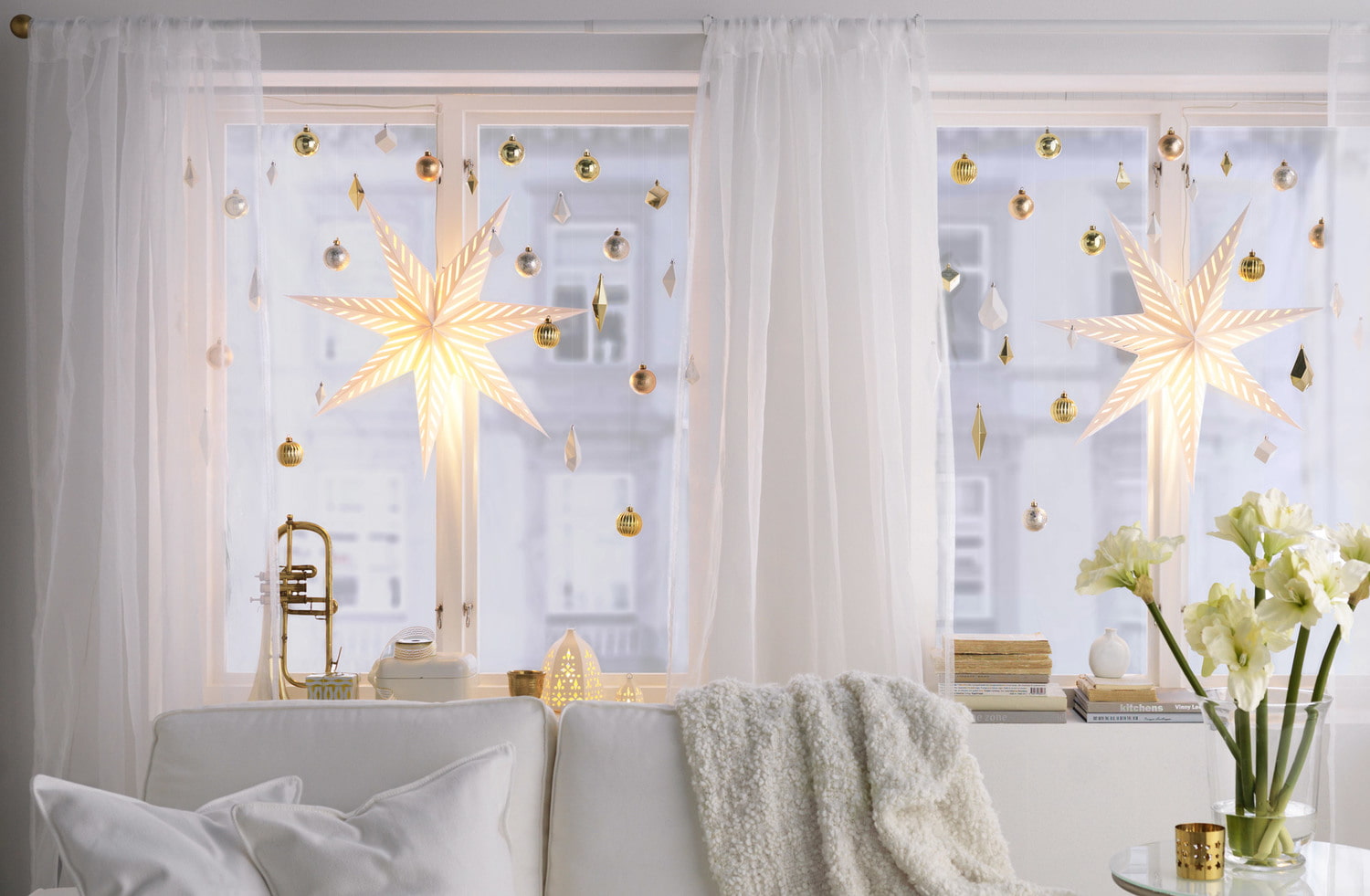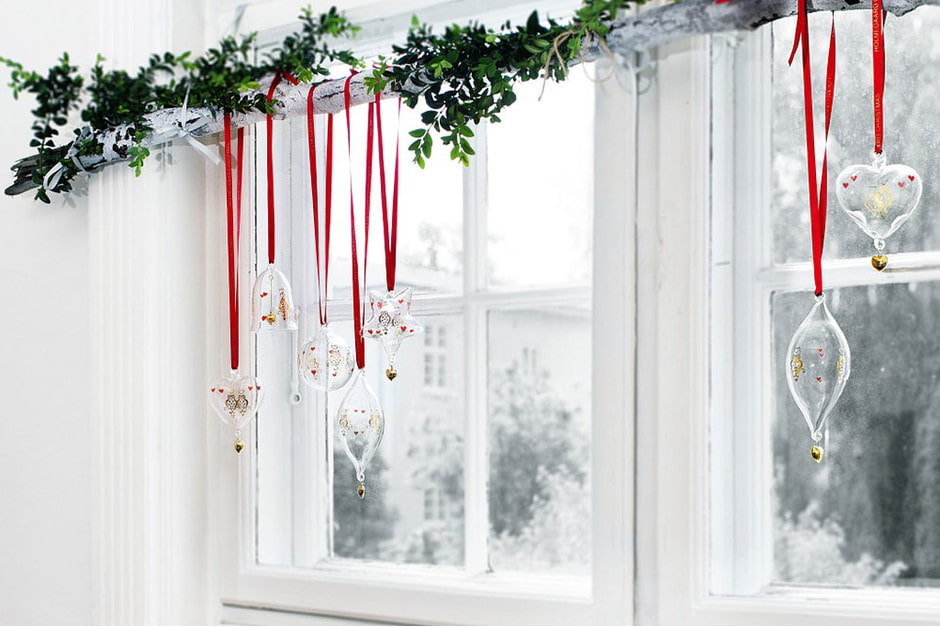 A new use can be found for traditional Christmas balls by hanging them on curtain rod... Placed at different levels, the balls will look like floating in the air, and when the lamps are lit, they will flicker and sparkle. Such decoration should be abandoned if small children or cats live in the house, or use plastic shatterproof products.