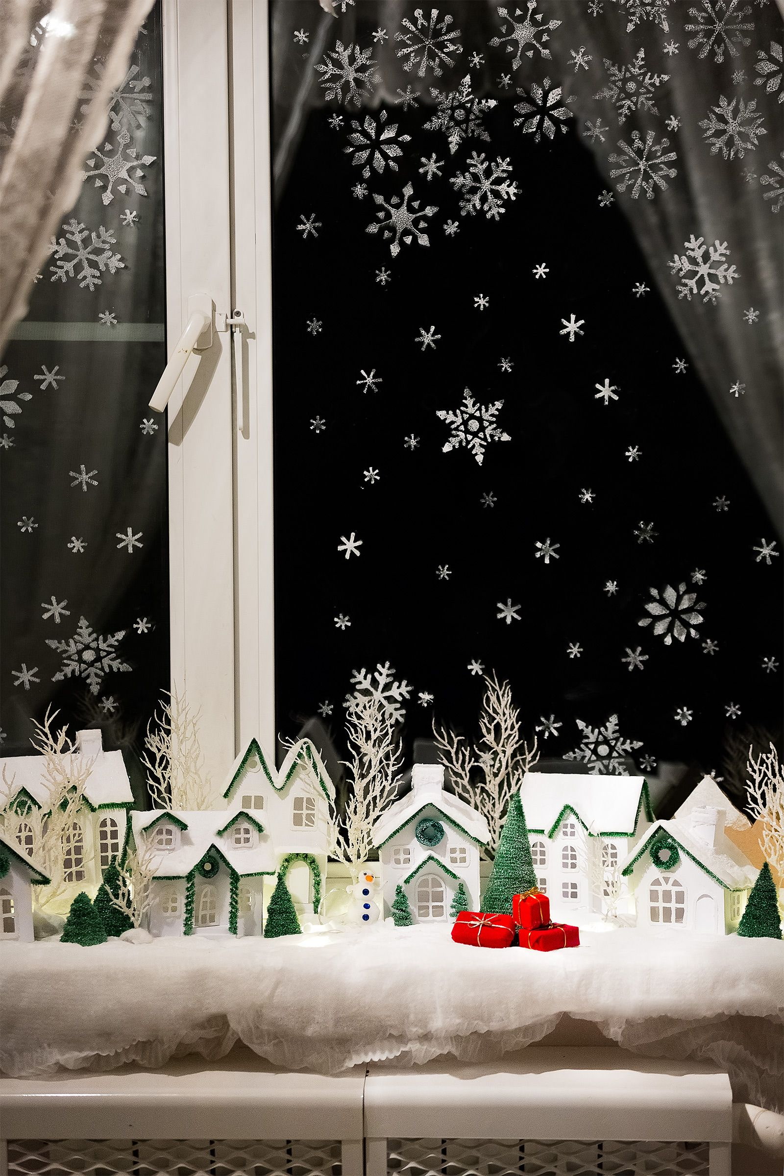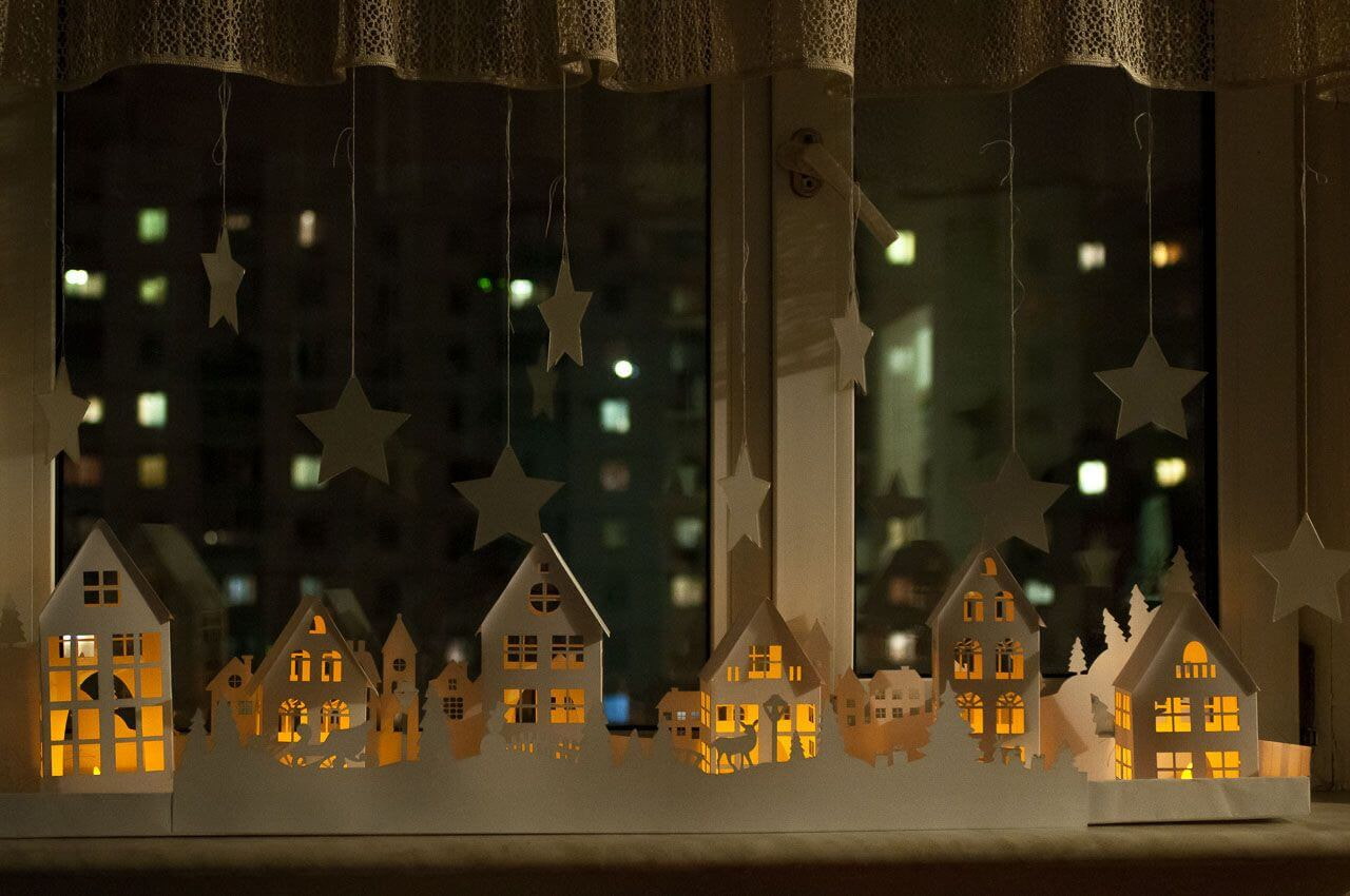 A small glowing city on the windowsill will awaken the feeling of a fairy tale and magic. The window can be turned into a real panoramic composition by placing houses made of cardboard, paper or ceramics in the foreground and complementing it with landscape applications on glass. It is worth hanging garlands of snowflakes or stars over the city.