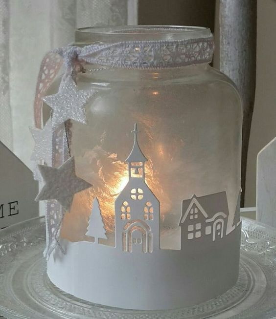 Use glass jars as candle holders for tealight holders. Decorate them with spray snow, leaving a small window, and a spruce twig.