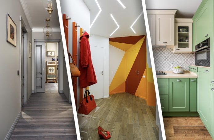 Lay laminate or parquet flooring transversely or diagonally: this will help to visually expand the corridor. Try to play with geometry by painting long and short walls in different colors - a monochromatic design will only emphasize the irregular shape of the passage.