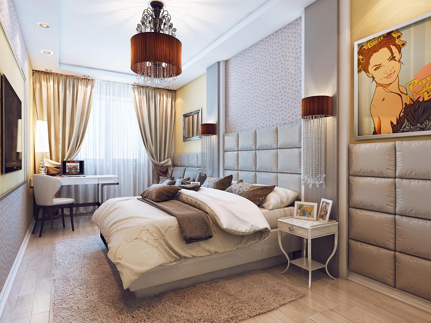 The smaller the area of the room, the lighter the palette should be. Choose white, beige, gray light tones for the main walls and ceiling, it is better to make the floor medium in saturation.