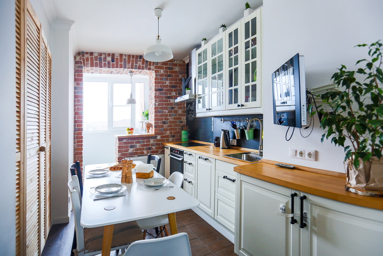 Example: a small sofa and a couple of armchairs instead of a large corner, a dining table with separate chairs instead of a massive kitchen corner. The only exception is the bed. In a couple's room, it certainly needs to be solid.